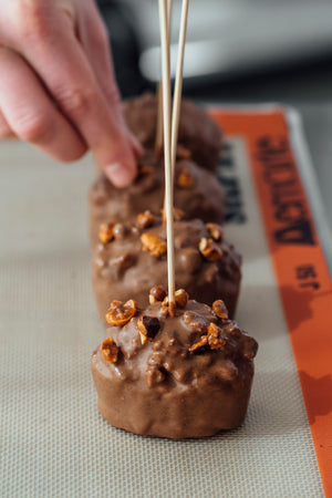 Master the art of crafting a smooth and glossy chocolate glaze, finished with a sprinkling of crunchy nuts for added texture.