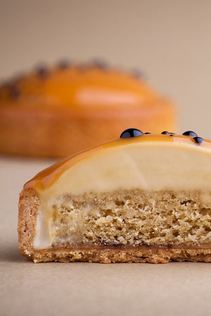 The creamy texture of the mousse and the thin coating of glossy caramel glaze emphasizes the tenderness of this tartlet.
