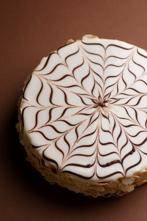 Esterhazy cake is famous for its appearance: the cake’s surface is decorated with a pattern of chocolate spider web.