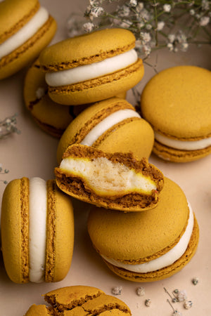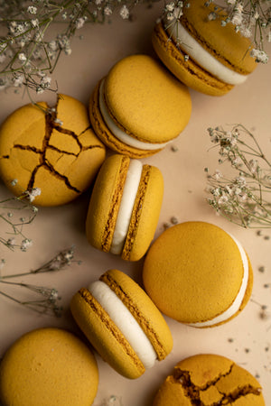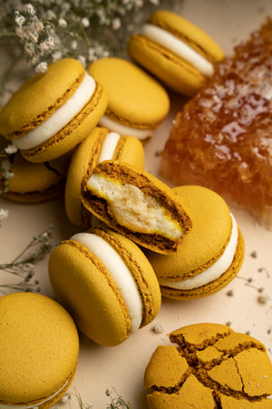 These macarons are composed of perfectly baked French meringue based shell, sour cream filling and honey sponge on the center.