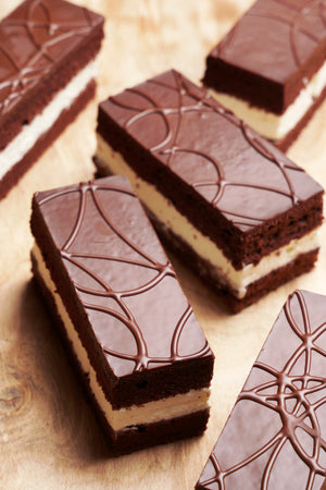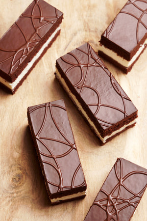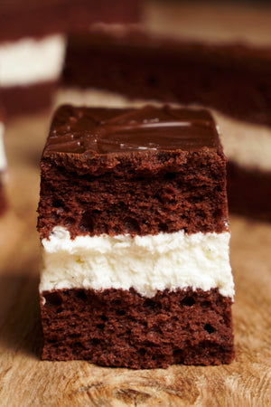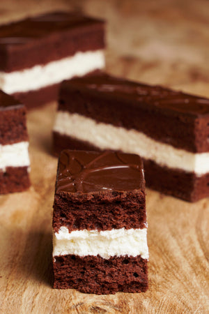 Moist and delicate texture of chocolate sponge is complemented by an airy vanilla cream and jazzy bitterness of dark chocolate.