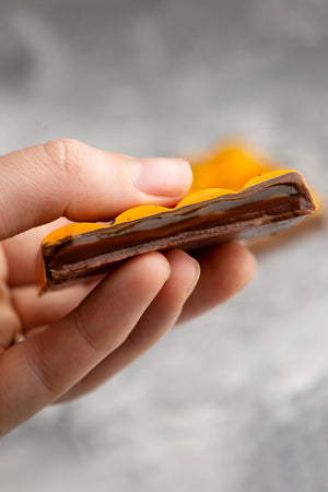 In this chocolate bar we use a classic combination of mango, passionfruit and milk chocolate.