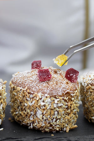 Moreover, the universal technique from chef Aleksandr Trofimenkov for preparing pate de fruit décor will allow you to complement the citrus flavor of the cake with a passing mention of raspberries.